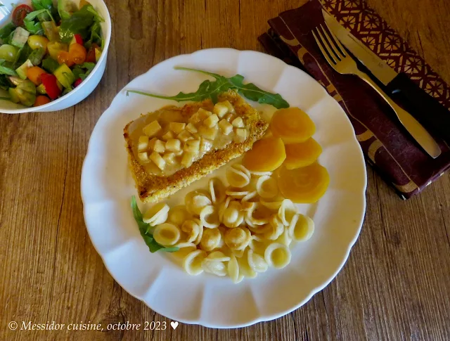 Servir les escalopes et les accompagner de pâtes ou de riz et de légumes, ici des orechietti et des betteraves jaunes.