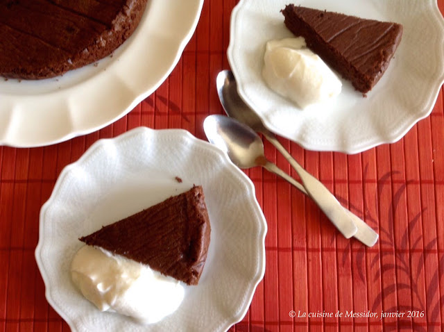 Ce petit délice est facile à réaliser et possède des qualités étonnantes, il ne contient ni farine ni crème et très peu de matière grasse à part le chocolat. Nous l’avons trouvé exquis ! Pour ce premier essai, je l’ai fait sans glaçage, servi simplement avec un yogourt à la vanille. Le lien vers la recette est inscrit ci-dessous. Merci Isa !